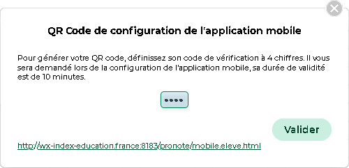 à côté de votre nom dans le bandeau en haut de la fenêtre. - Dans la fenêtre qui s'affiche, saisissez un code éphémère à 4 chiffres de votre choix pour générer un QR Code de configuration de l'application mobile, puis validez.